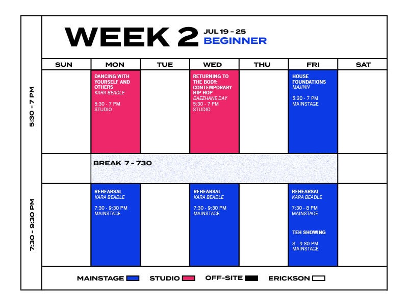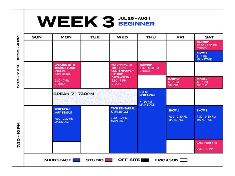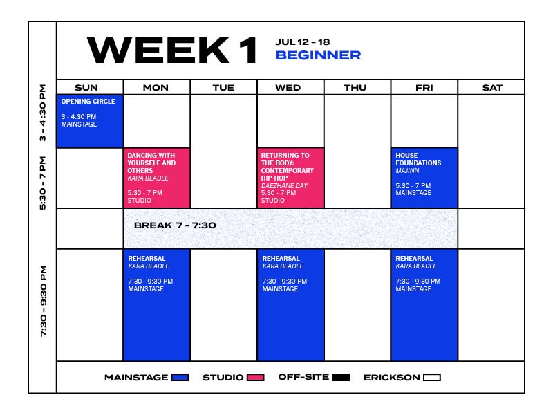 Registering for the Beginner Cohort signs you up for 3 evening classes a week followed by rehearsals with Kara Beadle, where you will make a new work to perform at the beginning of August!