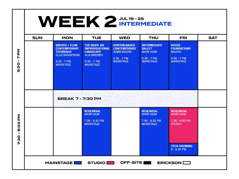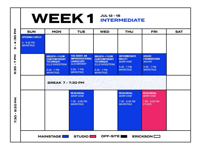 Registering for the Intermediate Cohort signs you up for 5 evening classes a week followed by rehearsals with Mark Haim, where you will make a new work to perform at the beginning of August!
