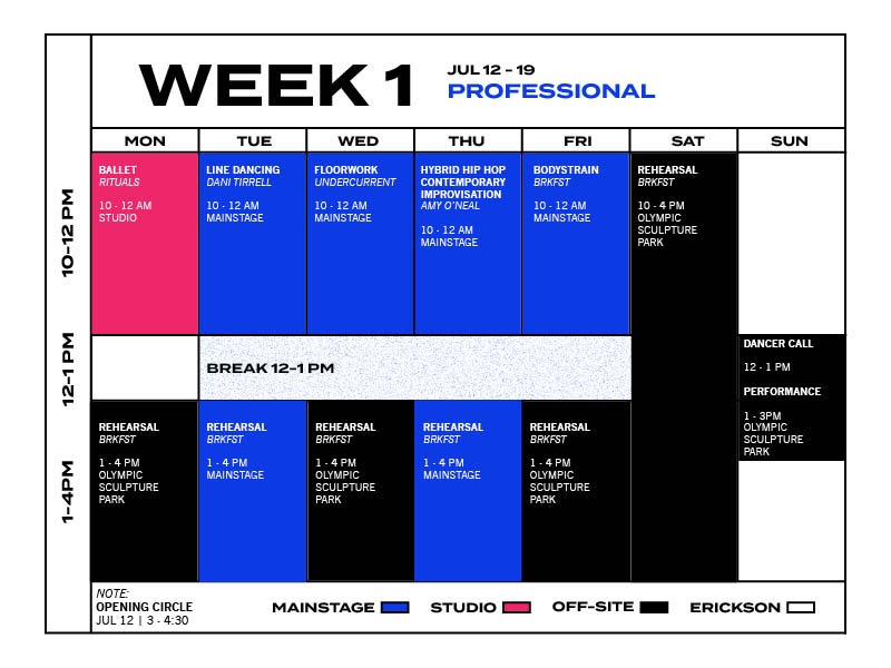 Register for WEEK 1 to make a new, site-responsive work with BRKFST at Seattle Art Museum’s Olympic Sculpture Park. Register for WEEKS 2-3 to make a new work for the stage with either Nia-Amina Minor or Undercurrent, or sign up for the Full Professional Cohort to learn and perform two new works in three weeks!