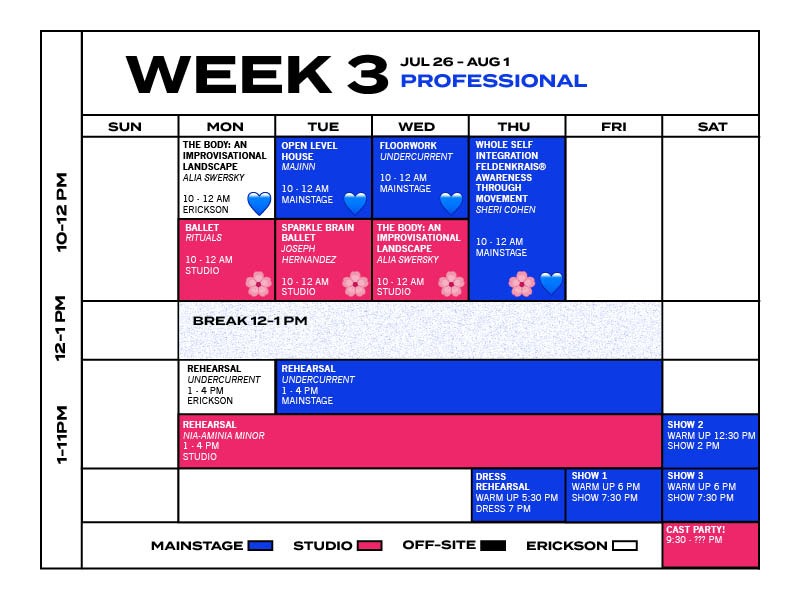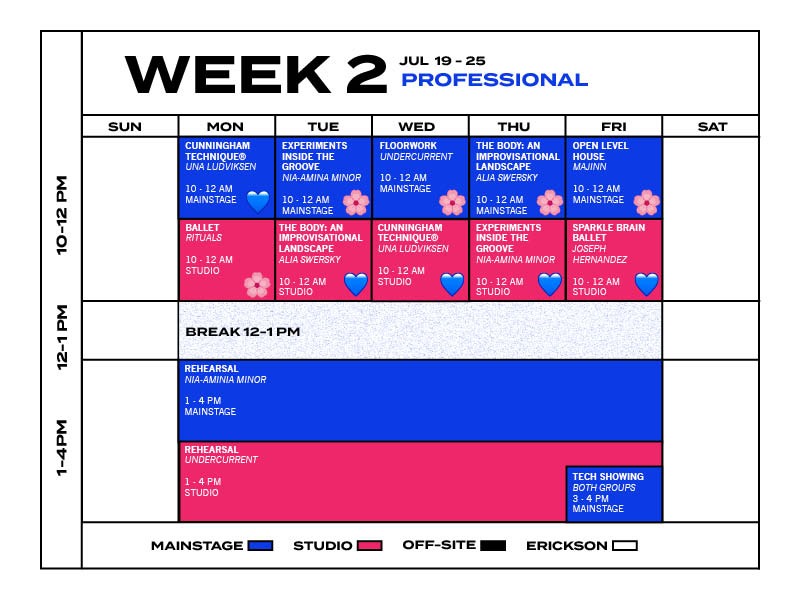 The Professional Cohort is for dancers with, or looking to gain, professional dance experience. Participants in this cohort have the opportunity to train with national/international dance artists and build relationships that can kickstart a professional career in this city and beyond. The Professional Cohort is a daytime intensive experience where you’ll dance all day in challenging morning technique classes, and new-work creation processes with established choreographers.